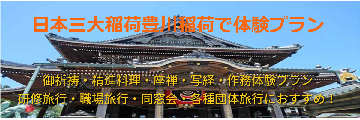 このプランでは豊川稲荷本殿にて商売繁盛・家内安全・福徳開運を祈願して頂き、僧侶指導のもとで座禅・写経・作務を体験、食の法話と作法にならい精進料理を食し頂く約3時間の体験プランです。